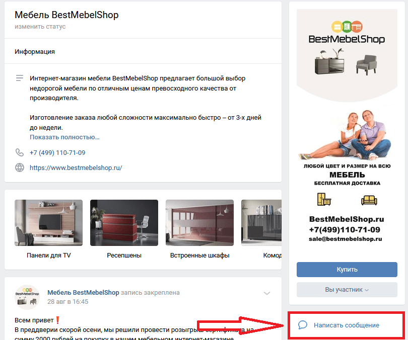 • Далее нажать на кнопку «Написать сообщение».