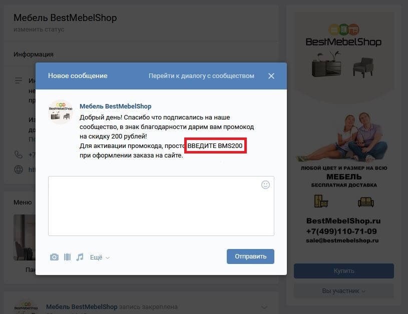 • В открывшемся диалоговом окне в ответном сообщении отобразится Ваш купон для заказа. Купон действует на каждое заказанное изделие и дает скидку до 200 рублей.