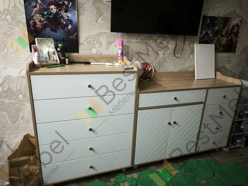 Комод отличный. Всего оба изделия - 2 метра. Конкретно мы заказали высокий комод шириной 80 см, а пониже - 1,20 м. Также дополнительно заказали секции для 2-х ящиков, и все ящики и петли с доводчиками. Комоды шикарные. Сборку брали у партнёров магазина - выше всяких похвал. Надеемся, прослужит долго.