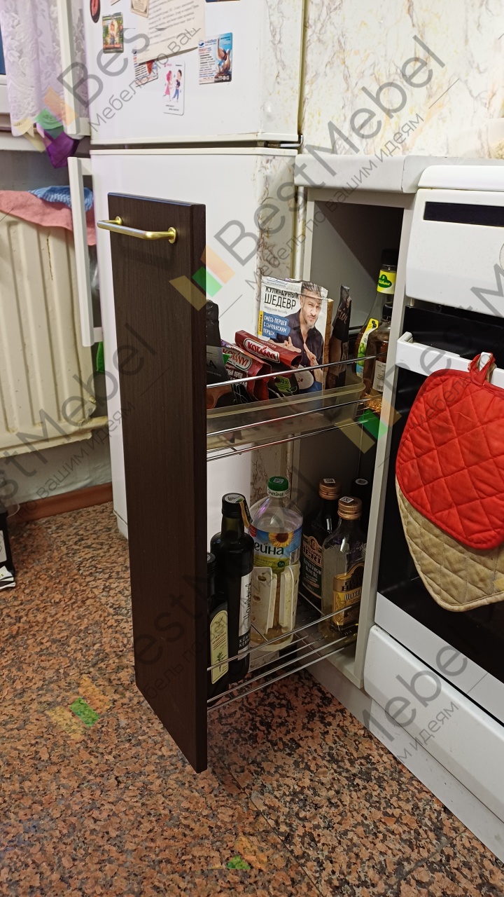 Заказывала в дополнение к кухне София, нужно было добавить узкий нестандартный шкафчик в небольшой промежуток. Получилось просто идеально, бутылочница встала как «доктор прописал».
