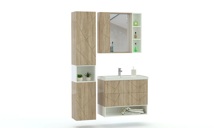 Мебель для ванной Альта 5 BMS отличается актуальным дизайном, эффектно сочетая фасады в древесном оттенке с геометричной фрезеровкой и выделенные белым ниши. В комплект входят тумба под раковину с двумя выдвижными ящиками и открытой полкой, пенал с нишей и шкафчик с зеркалом и боковыми отделениями для хранения уходовых средств. Благодаря подвесной конструкции предметы экономят пространство и облегчают уборку. Купить мебель для ванной Альта 5 BMS приглашаем выгодно в наш интернет-магазин.