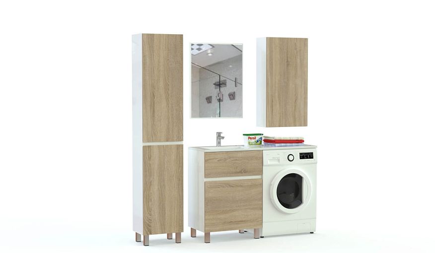 Мебель для ванной Лондон 5 BMS предназначена для просторных помещений, позволяя органично вписать бытовую технику и разместить большое количество вещей. В комплекте напольная тумба с широкой столешницей, объединяющей раковину и стиральную машину, навесное зеркало, высокий пенал и распашной шкафчик. Минималистичный дизайн предметов и исполнение в нейтральном древесном цвете делает их универсальными для современных интерьеров. Купить мебель для ванной Лондон 5 BMS вы сможете по доступной цене в нашем интернет-магазине.