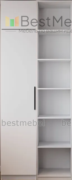 Современный дизайн и стильная фурнитура придают шкафу изысканный вид, делая его не только функциональной, но и декоративной частью интерьера. Однодверный шкаф с полками под белье или другие предметы обихода, прекрасно впишется в пространство в комнате, белого цвета шкаф с черными стильными ручками.