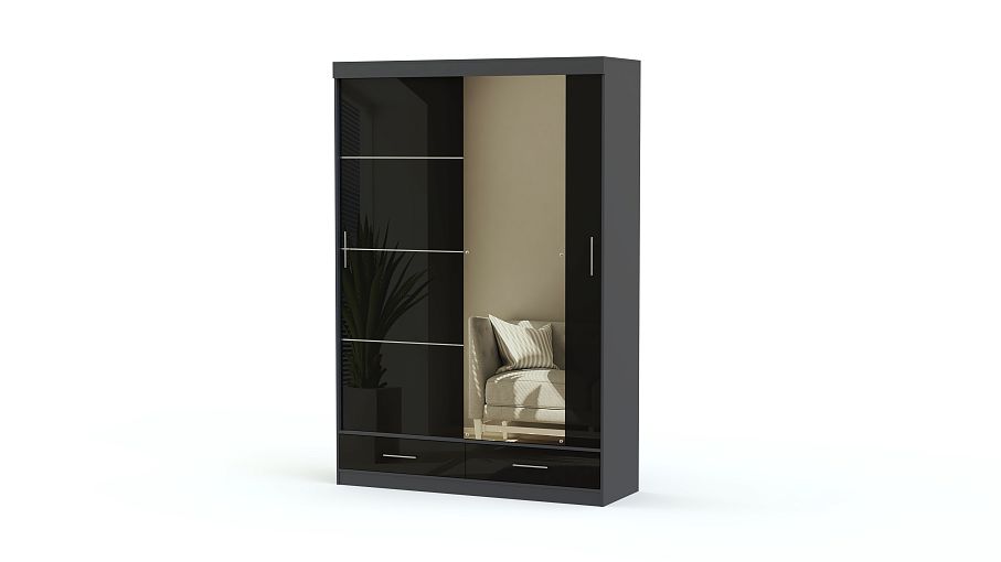 оскошный черно-белый шкаф Марсель станет украшением современного интерьера Хай-Тек. Глянцевая поверхность изделия будет переливаться в лучах солнечного света, делая его центральным элементом в дизайне комнаты. По желанию заказчика дверь фасада может быть зеркальной или из глянцевого МДФ.