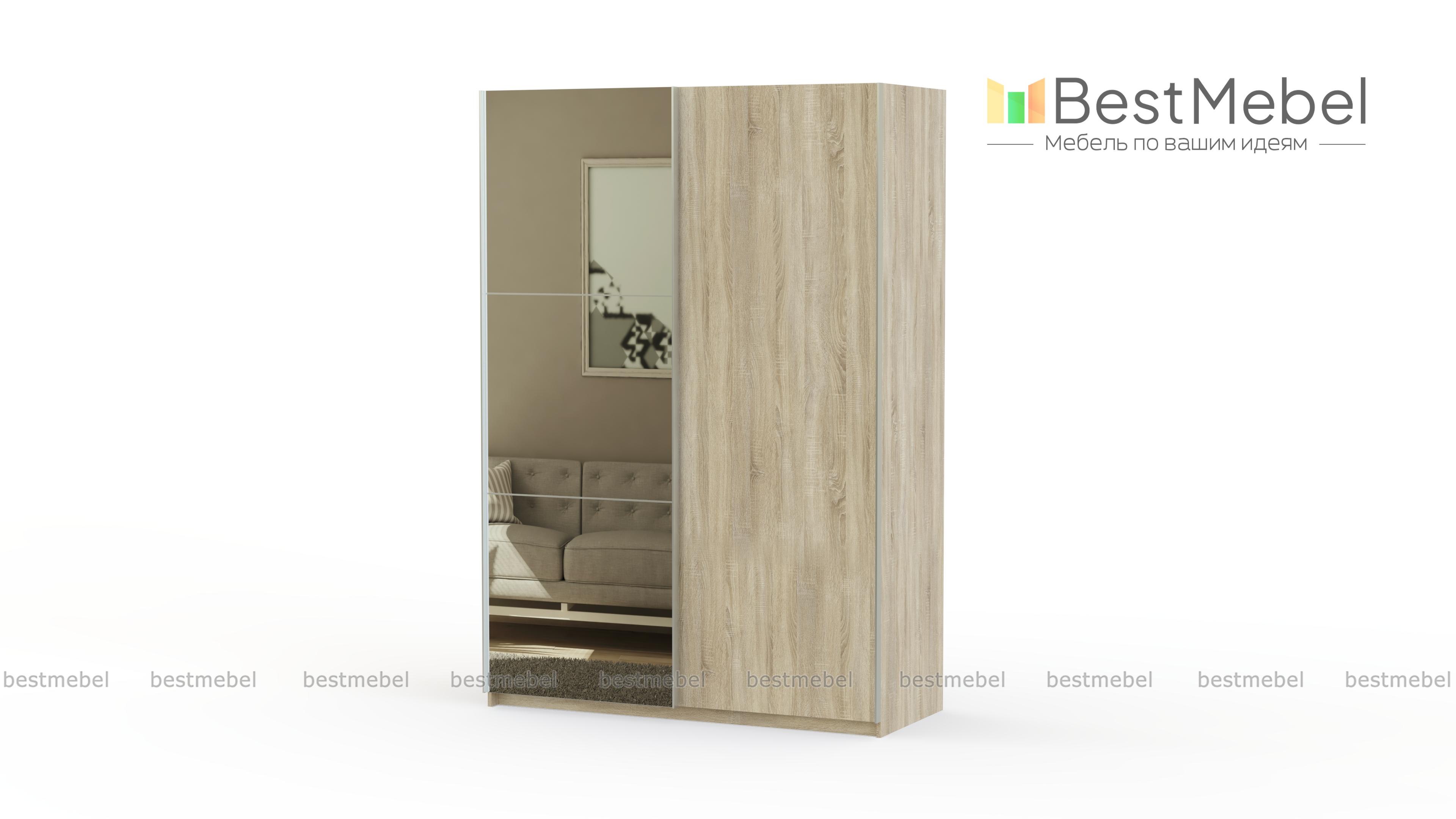 Ультрасовременный шкаф-купе с оригинальным дизайном. Светлый фасад и зеркала делают конструкцию визуально легкой и не громоздкой. Шкаф изготовлен из ламинированного ДСП, которое не подвержено действию механических повреждений, стойкое к влаге и простое в уходе.
