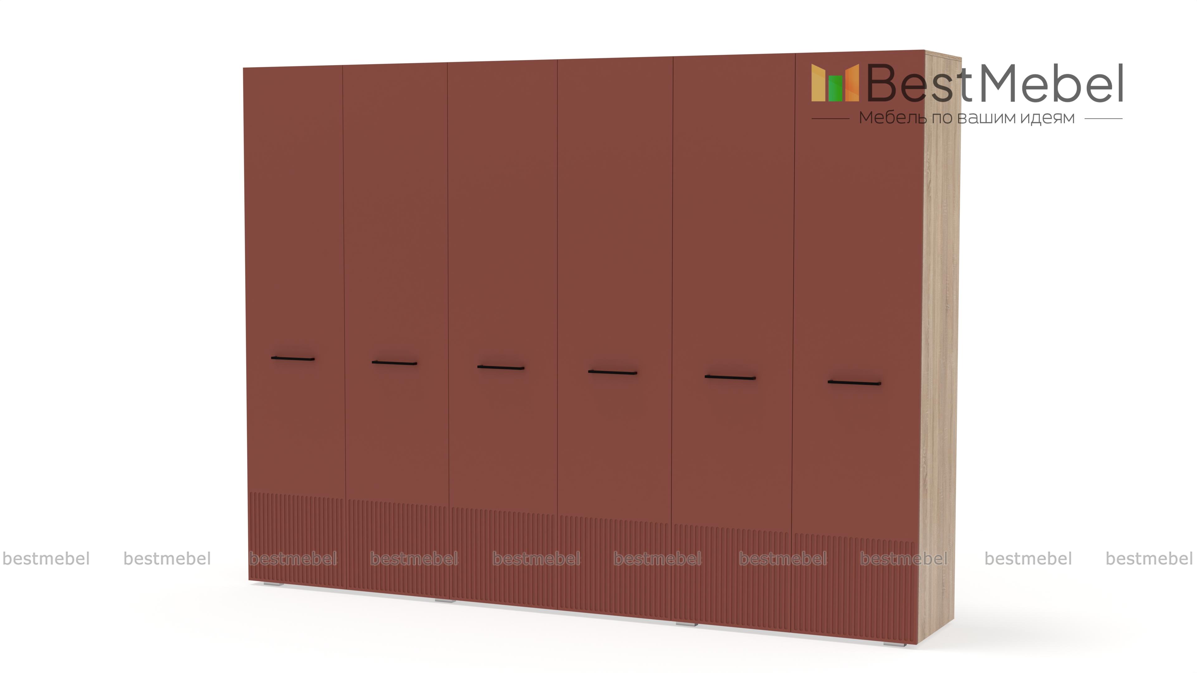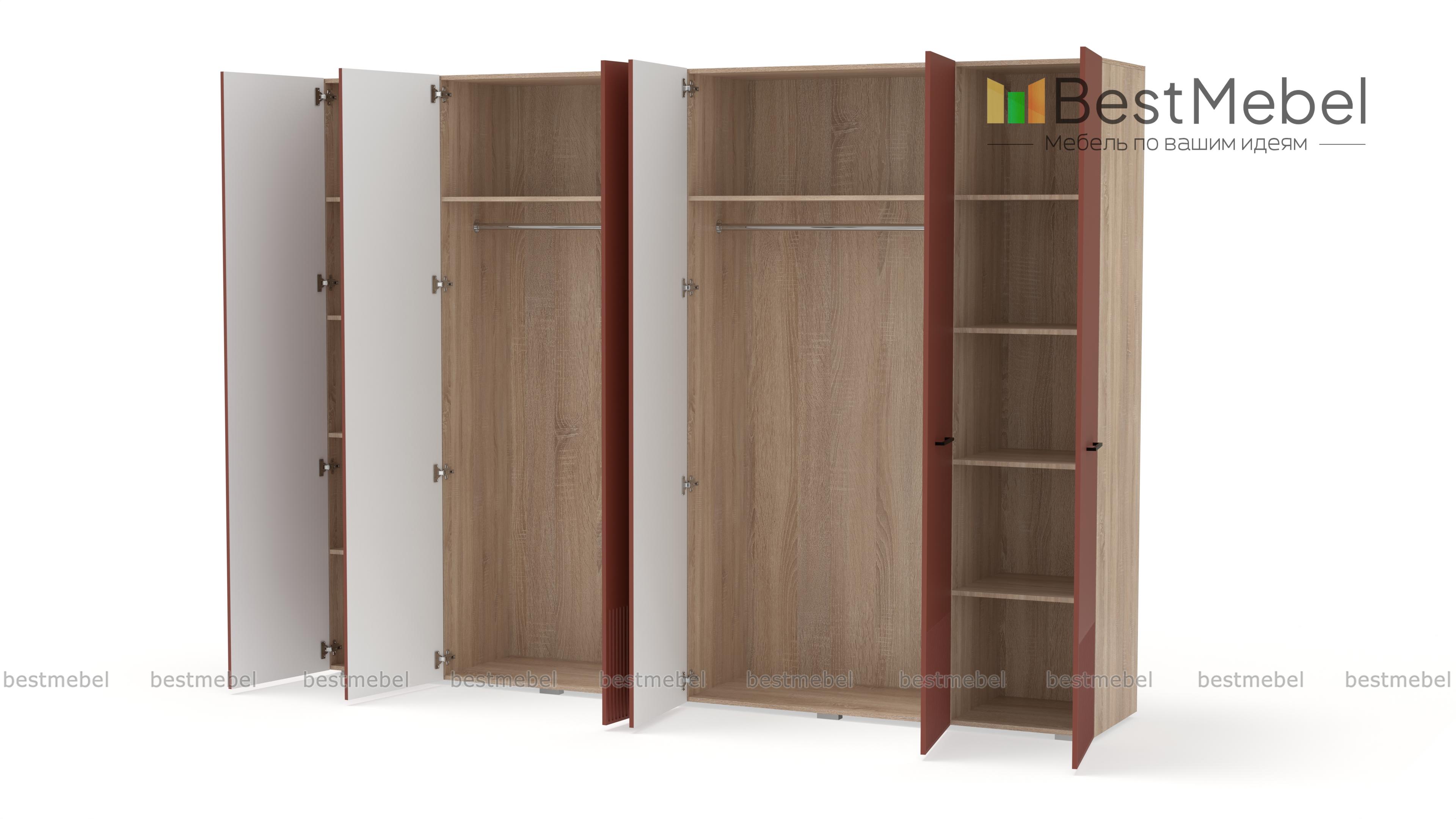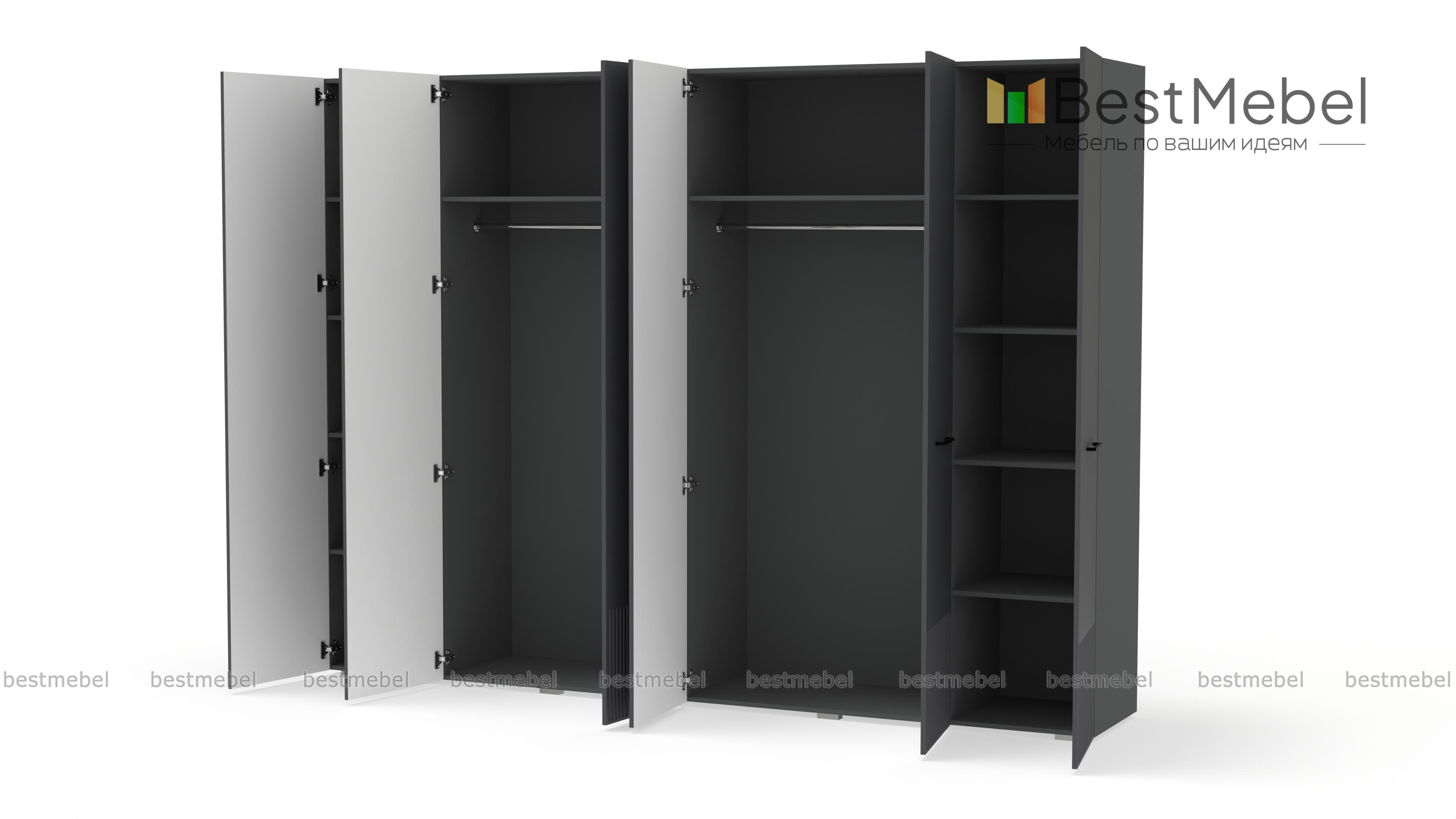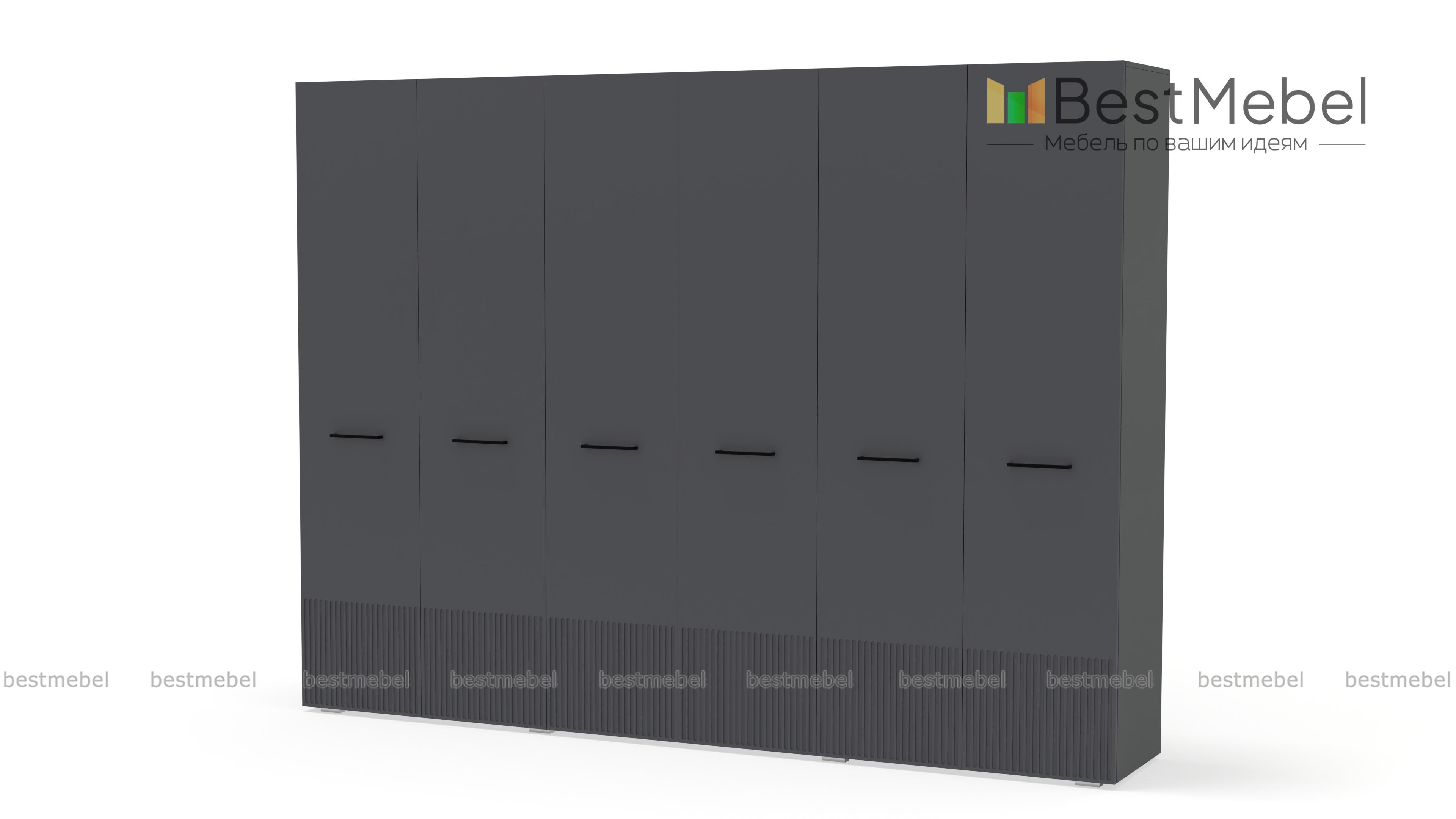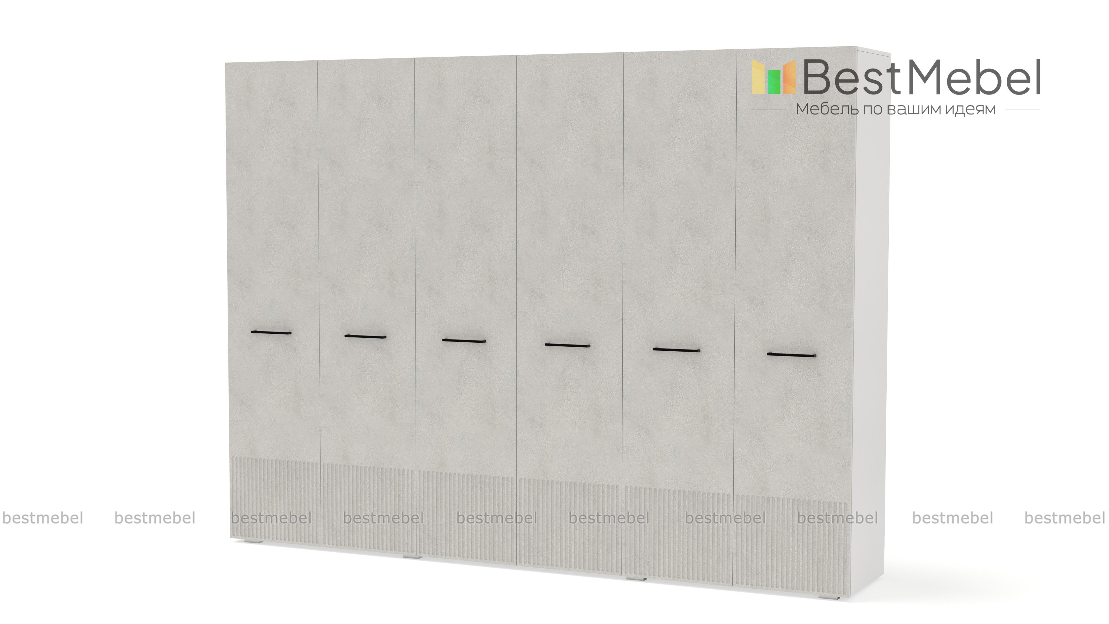Шкаф распашной Декарт 6 BMS с шестью дверцами создан для хранения в просторных комнатах и обладает отличной вместительностью. Габариты шкафа скрадывает светлый оттенок, фрезеровка в нижней части фасада — практичное и стильное решение. Порядок в вашем гардеробе помогут легко поддерживать две центральные штанги и вместительные бельевые полки по бокам. Купить шкаф распашной Декарт 6 BMS, изготовленный по вашим размерам, приглашаем на сайт нашего интернет-магазина.