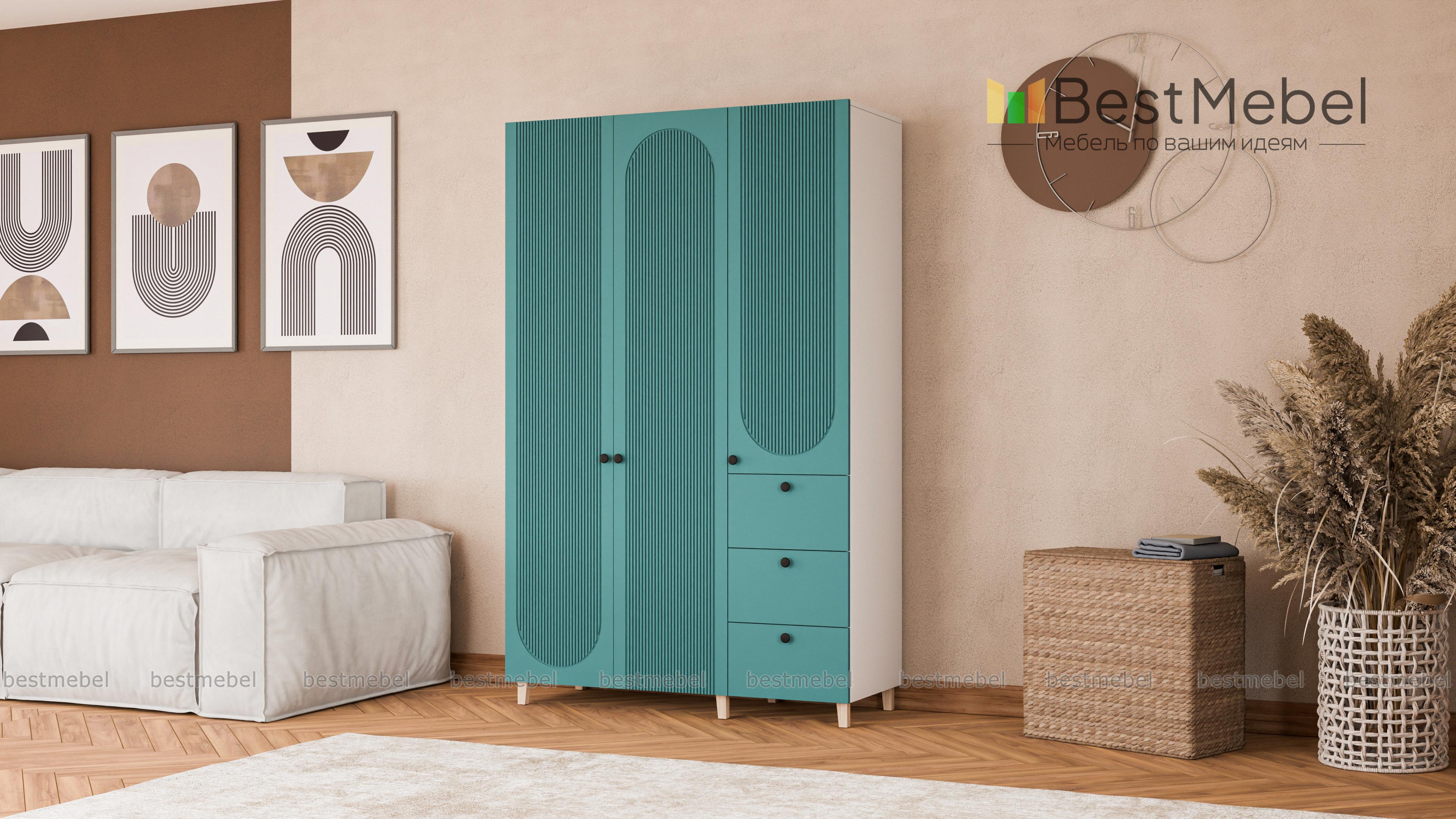 Шкаф распашной Рене 24 BMS удобен тем, что позволяет хранить не только вещи на вешалках, но и мелкий трикотаж, аксессуары, постельное белье. Двухдверное платяное отделение дополнили комбинированным пеналом с тремя выдвижными ящиками снизу. Цветной фасад шкафа украшает стильный геометричный рельеф, для легкости конструкции — высокие деревянные ножки. Купить шкаф распашной Рене 24 BMS вы сможете в нашем интернет-магазине, подобрав размеры и наиболее походящую цветовую гамму.