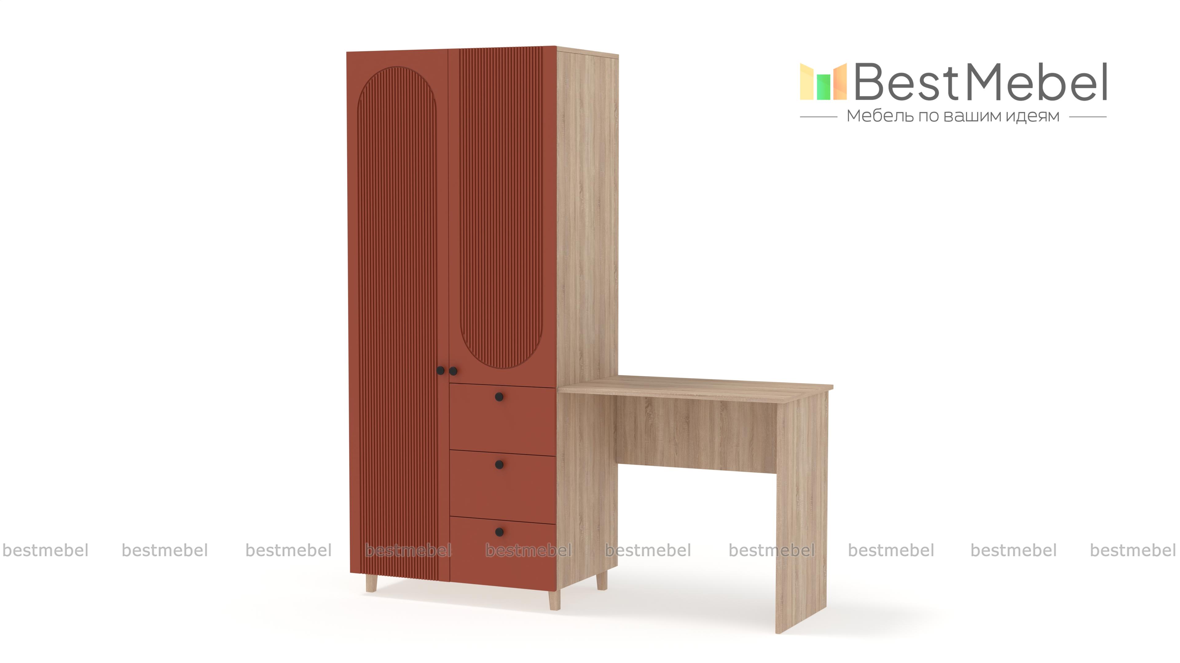 Шкаф со столом Рене 6 BMS объединил рабочую зону и удобную систему хранения. Элегантный гардероб с высокими ножками и фрезеровкой дополнен прямоугольным письменным столом справа. Для хранения вещей предусмотрены распашное отделение и ящики, а размеры столешницы позволяют разместить ноутбук, письменные принадлежности, материалы для творчества. Купить шкаф со столом Рене 6 BMS вы сможете в нашем интернет-магазине, подобрав размеры и наиболее подходящую цветовую гамму.
