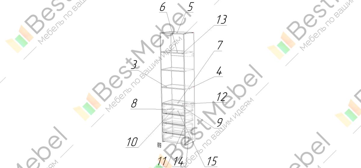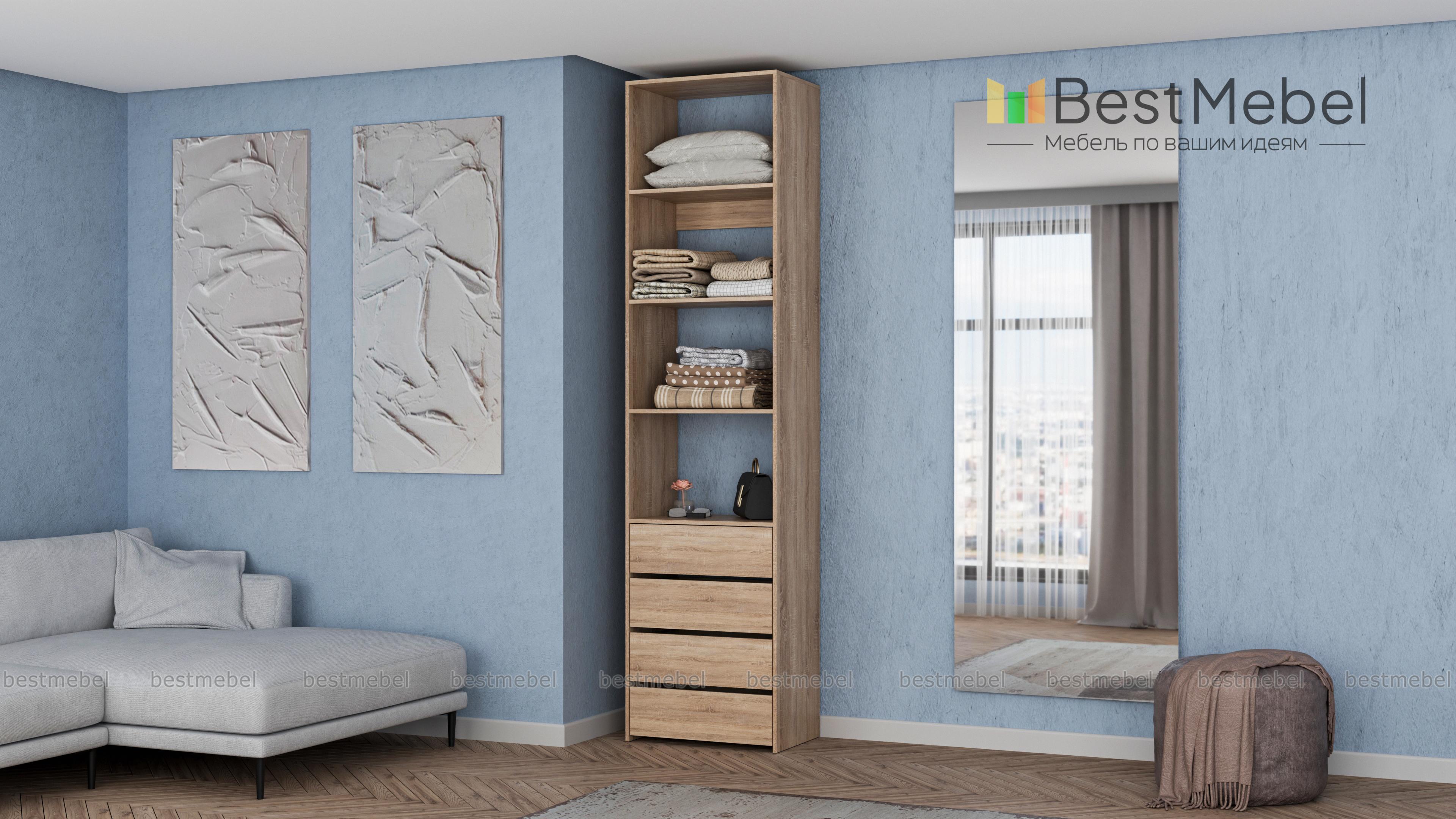 Стеллаж для одежды Мирта 35 BMS может дополнить другие стеллажи серии или использоваться самостоятельно. Три бельевые полки сверху дополнены четырьмя выдвижными ящиками для трикотажа, аксессуаров и прочих мелких вещей. Узкий стеллаж легко вписывается в ниши, маленькие спальни, прихожие или гардеробные, решая проблему ограниченного пространства. Купить стеллаж для одежды Мирта 35 BMS приглашаем в наш интернет-магазин в любом размере и оттенке из каталога.