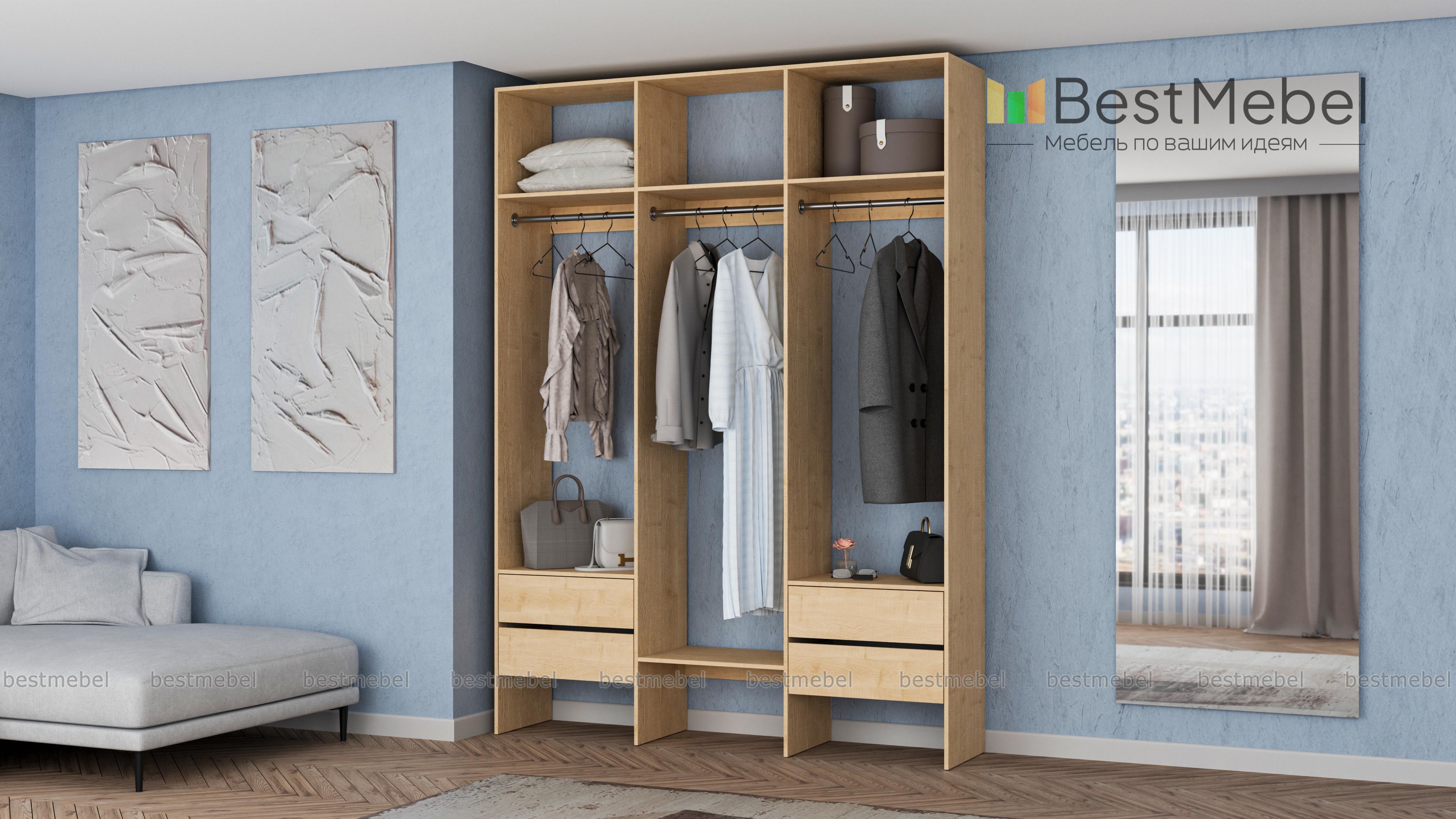 Стеллаж для одежды Мирта 58 BMS — это удобная база для вашей прихожей или гардеробной комнаты. Три перекладины позволяют разместить вешалки с короткой и длинной одеждой, для коробок и сложенных вещей предусмотрены полки, а для мелочей — две пары выдвижных ящиков. Лаконичное оформление и возможность выбора оттенка делают трехсекционный стеллаж практически универсальным. Купить стеллаж для одежды Мирта 58 BMS, изготовленный по вашим размерам, приглашаем в наш интернет-магазин.
