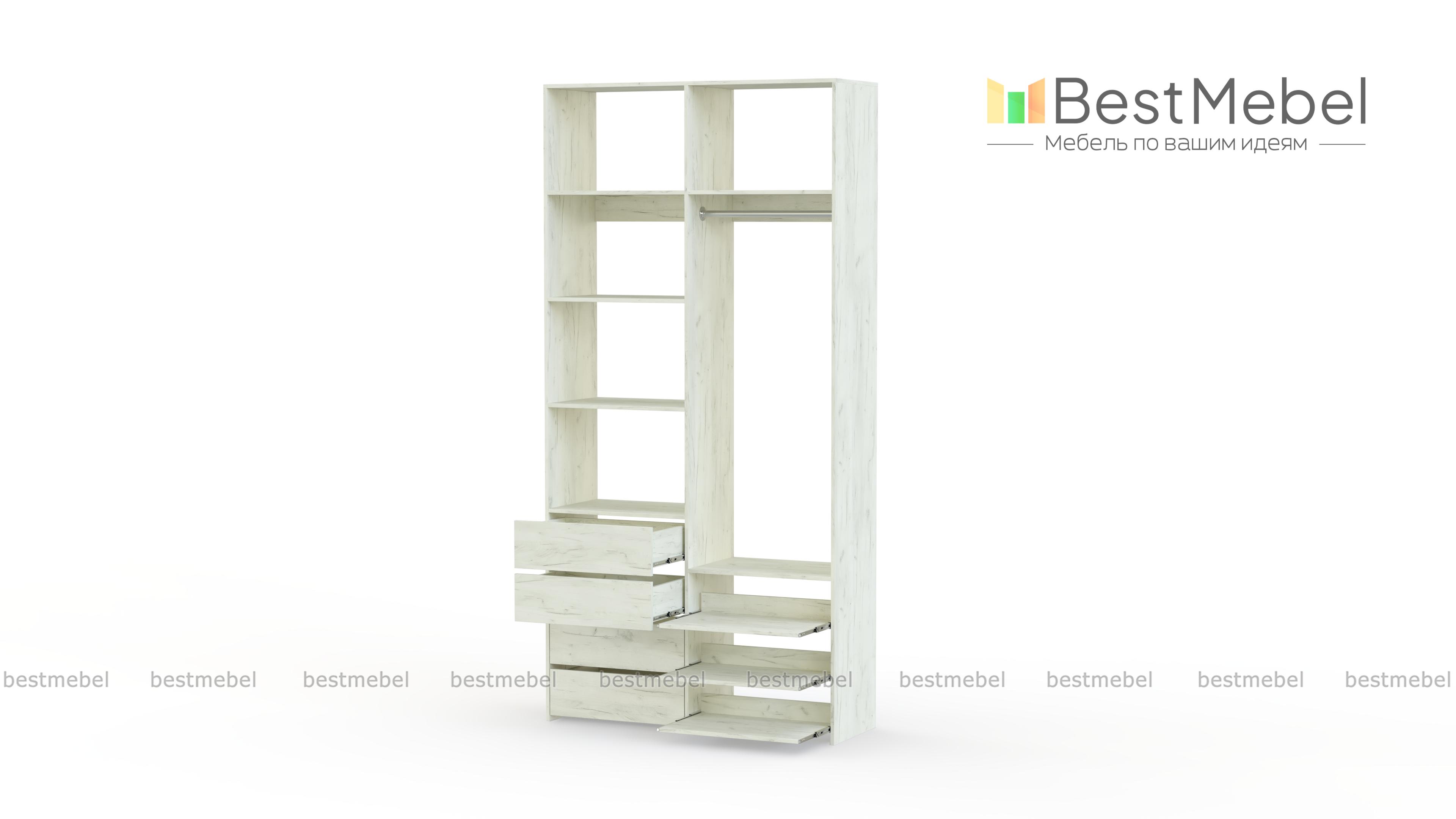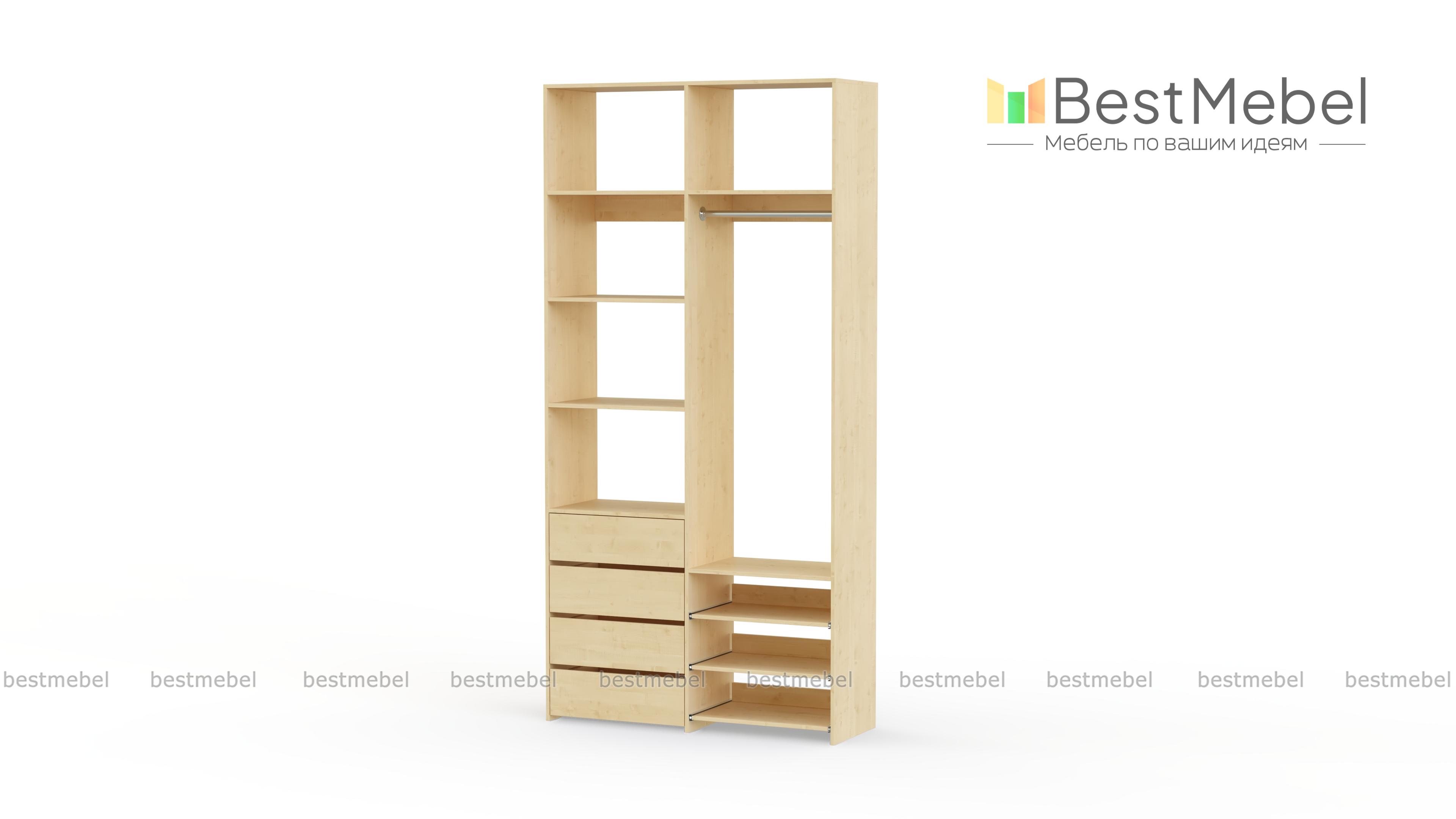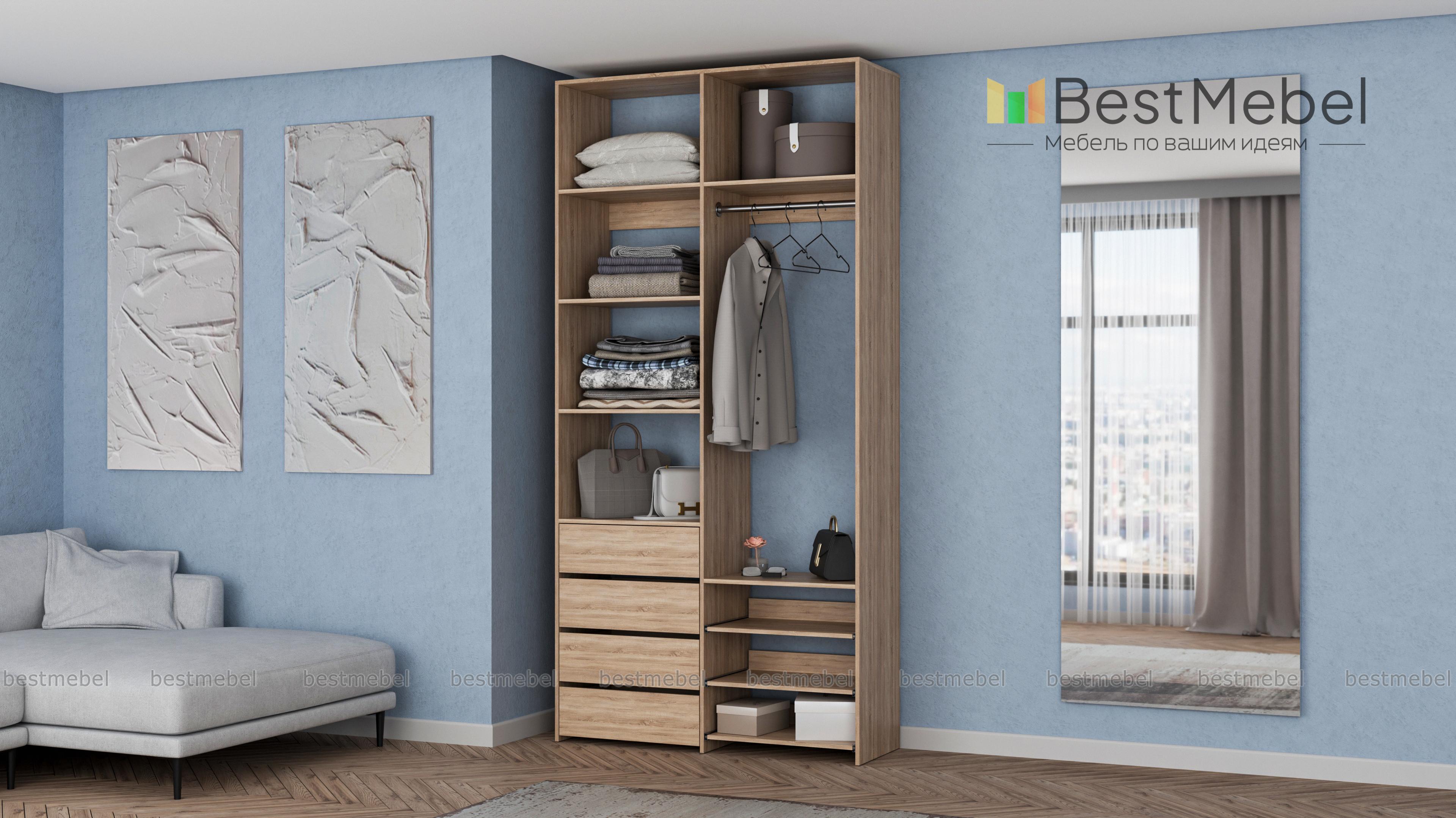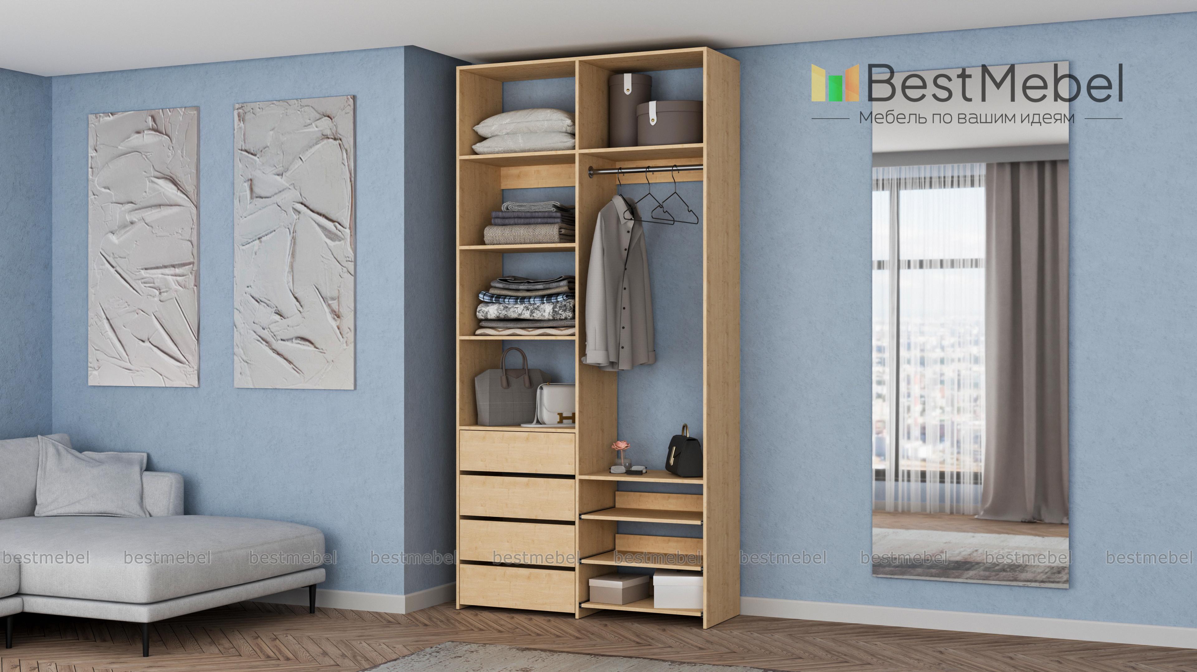 Стеллаж для одежды Мирта 87 BMS оптимален для небольших пространств. Штанга, выдвижные полки и ящики, а также пять просторных бельевых секций обеспечивают достаточно места для хранения базового гардероба. Простой и функциональный дизайн в сочетании с широкой цветовой гаммой позволяют легко комбинировать стеллаж с другой мебелью. Купить стеллаж для одежды Мирта 87 BMS с изготовлением по индивидуальным размерам вы сможете недорого в нашем интернет-магазине.