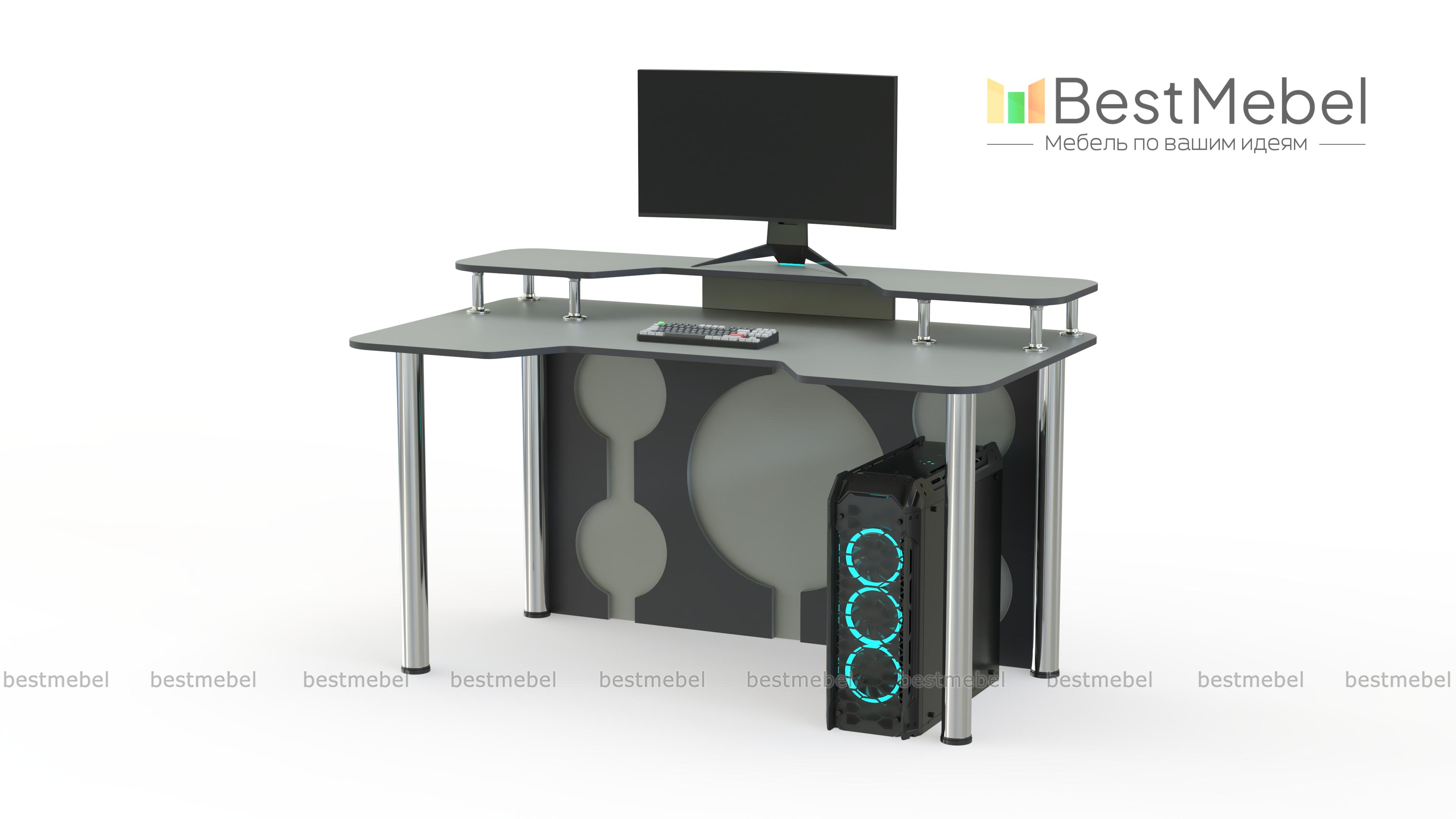 Игровой стол Европа 15 BMS эффектно впишется в современный интерьер и поможет обустроить комфортное геймерское пространство. Легкая и устойчивая благодаря регулируемым хромированным опорам, модель выполнена в контрастной черно-белой гамме. Столешница с эргономичной выемкой переднего края дополнена надстройкой под монитор и периферийные устройства, задняя стенка декорирована круглыми вырезами. Купить игровой стол Европа 15 BMS приглашаем в наш интернет-магазин с возможностью изготовления по индивидуальным размерам.