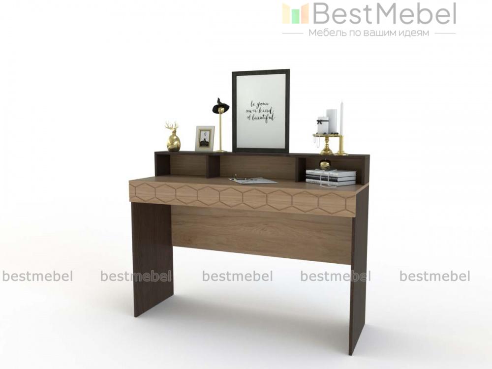 Туалетный стол Монте 5 BMS выполнен в древесных тонах теплой светлой гаммы и декорирован по фасаду накладкой с оригинальным фрезерованным орнаментом. Для удобного хранения мелочей элегантный столик оборудован широкой двухуровневой столешницей с полочкой, к которой крепится зеркало, и вместительными нишами. Износостойкость поверхностей и простота ухода помогут надолго сохранить модели эстетичный вид. Купить туалетный стол Монте 5 BMS и сделать спальный интерьер функциональнее вам поможет наш интернет-магазин.