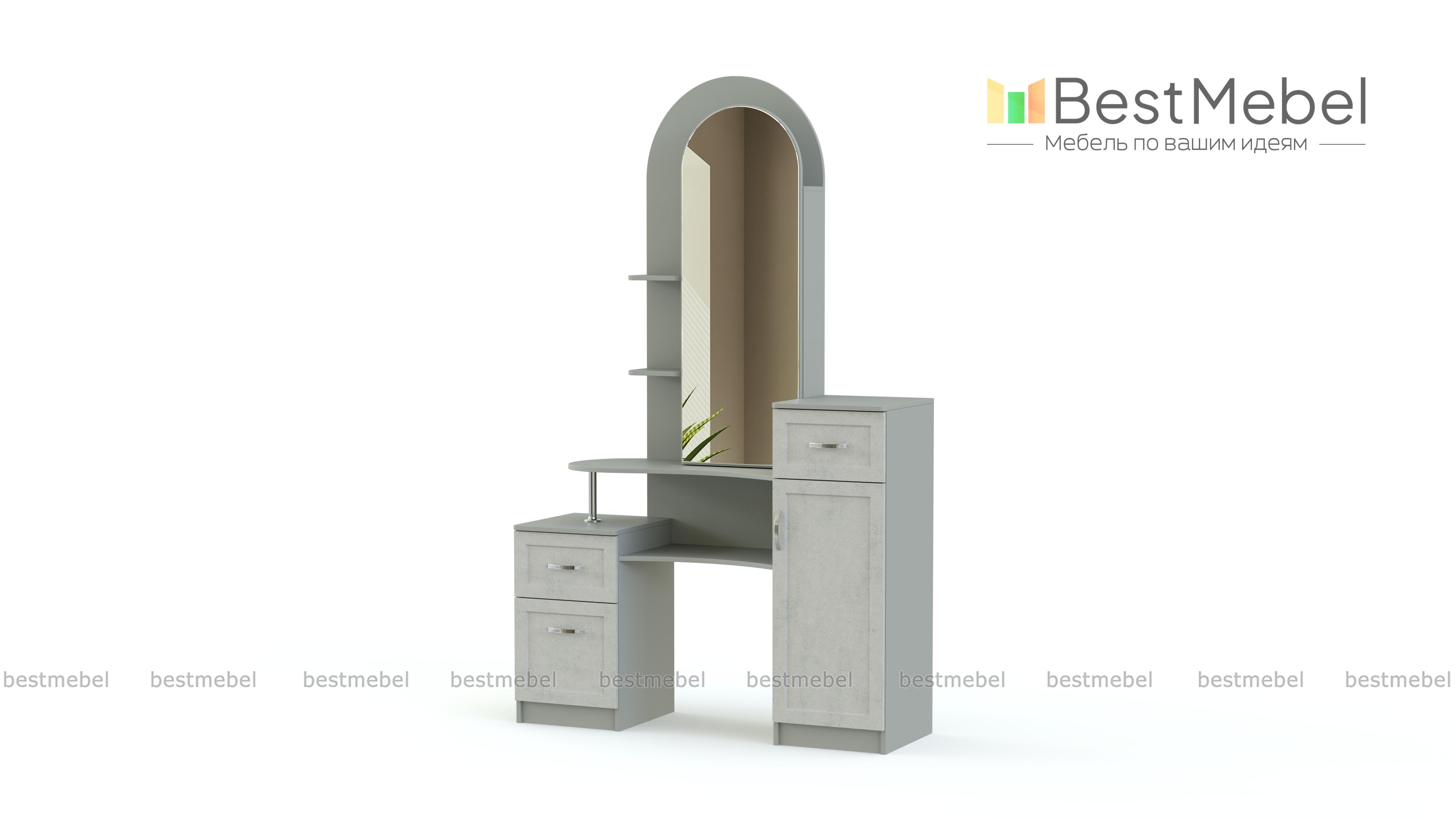 Классическое трюмо оригинального дизайна Камелия BMS подойдет для оформления классических спален и гостиных. Благодаря конструкции, модель не только привлекательна внешне, но и на редкость функциональна. Перед большим зеркалом в полный рост можно не только делать макияж, но примерить одежду, а откинув зеркальную дверцу, вы найдете несколько полок для мелочей. Интересно расположение небольшой тумбы и комода, а металлическая фурнитура и асимметричные линии столешницы смотрятся особенно необычно.