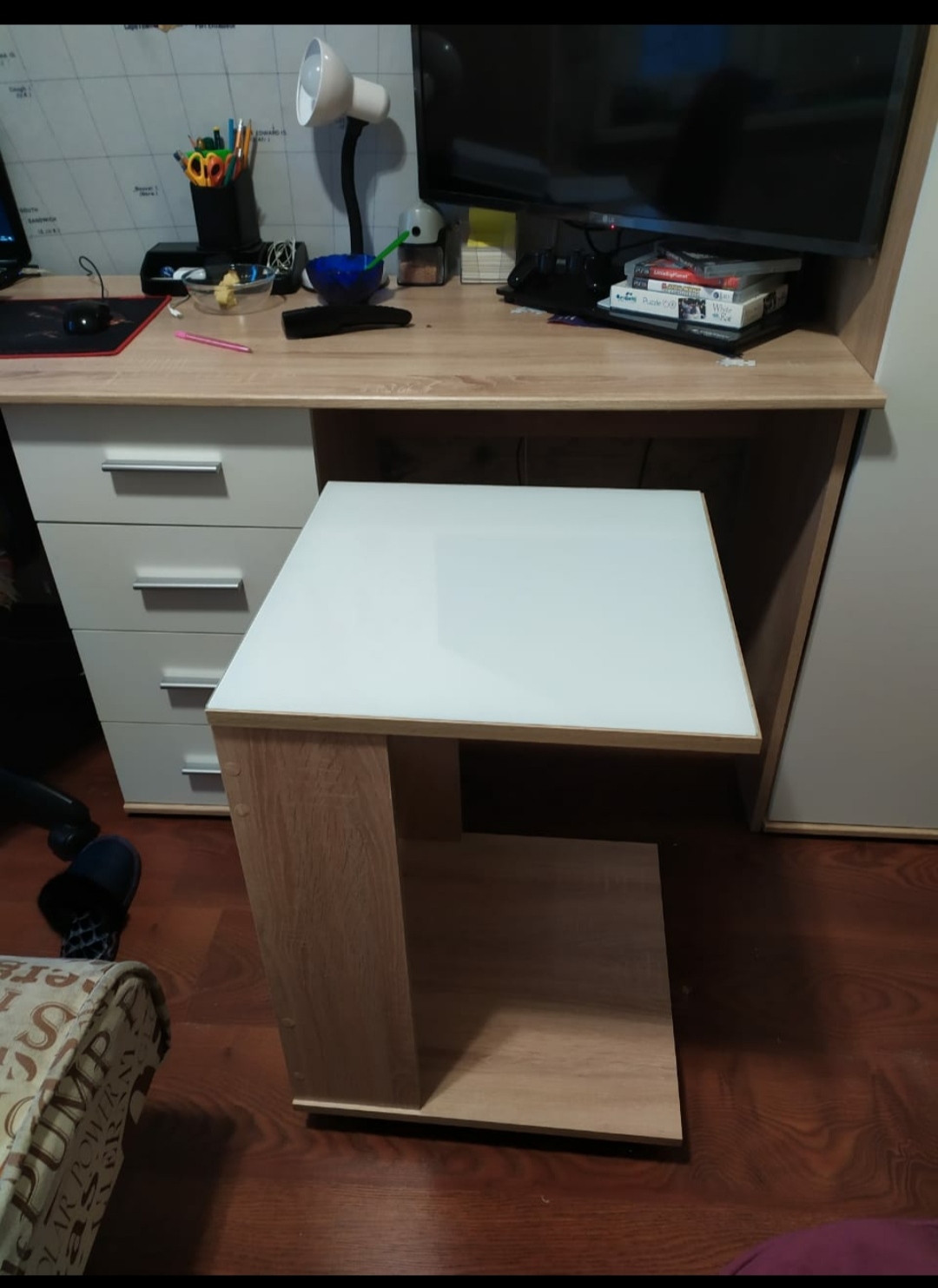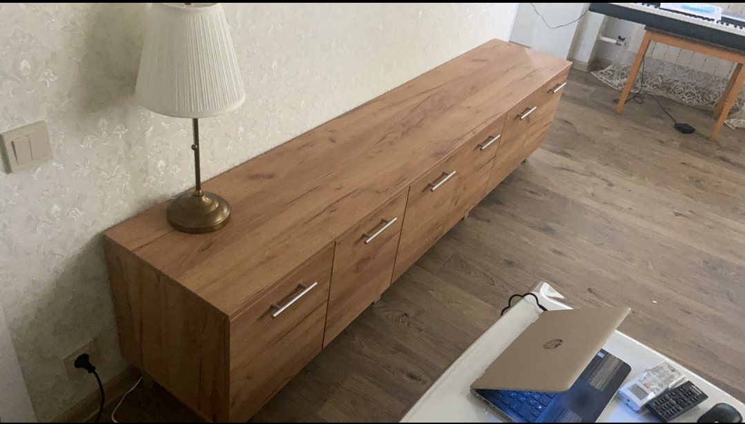 Отличная тумба, приятный современный вид, цвет выбрали золотой крафт, смотрится прекрасно, отдельно докупались ножки хром в цвет ручек, чтобы влажную уборку делать, но можно было и подвесить. На тумбу кладу ноутбук, сумки гостей, фрукты/десерты, много чего, внутрь вмещается много контейнеров с всякой всячиной: книги, нитки, лекарства и пр. Я на неё сажусь иногда, выдерживает (по этой причине не хотели подвешивать). Размер тумбы на фото: 220 × 44× 40 см. Рекомендую!